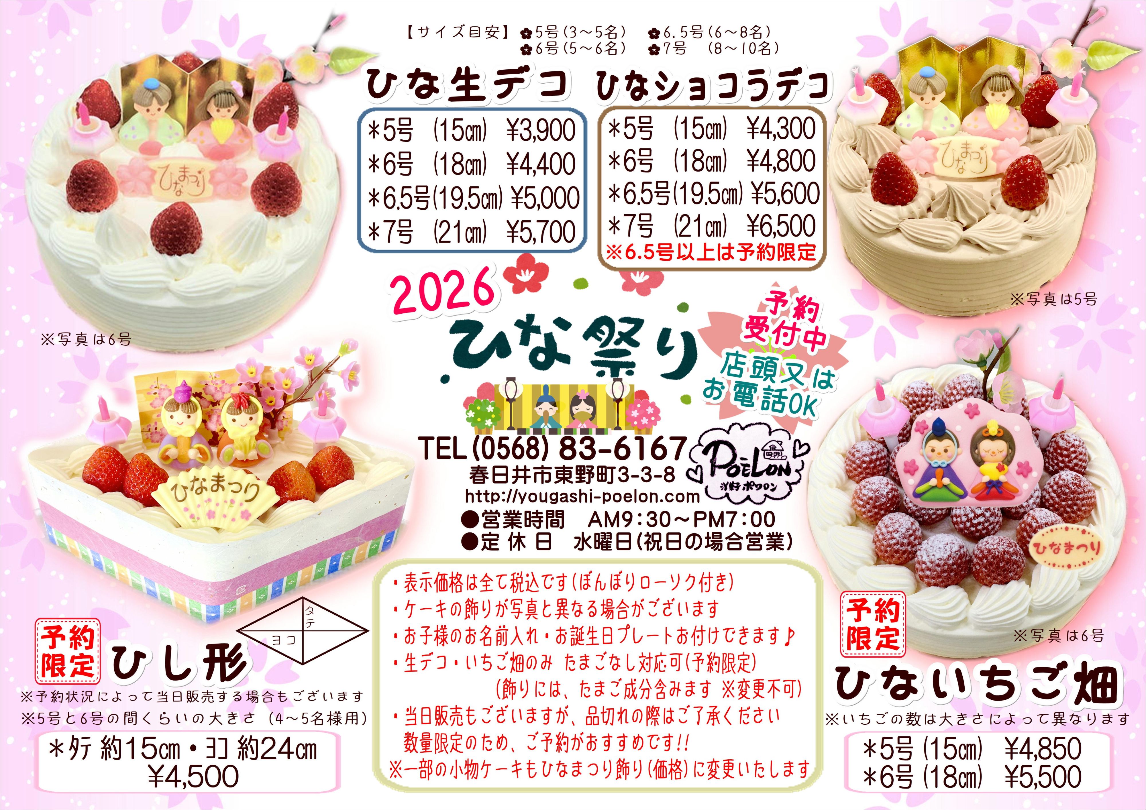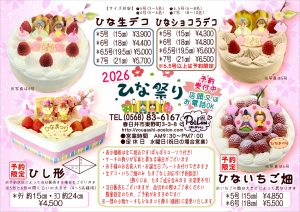 ひなまつりデコレーションケーキのご案内です(ご予約は店頭又はお電話でも承ります)